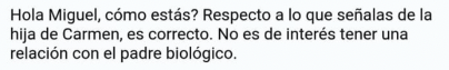 - Acerca de un tópico que involucra un menor de edad que ella cita cada vez que puede, Derivado de desconfianza existente acerca de infidelidades de CaCas, la desconfianza venia desde el inicio de la relacion osea desde Julio 2013 (desde el inicio), ya que como se iba de mi casa cuando algo le molestaba, nunca se sabia donde se quedaba, luego desde Enero de 2014 se terminó la relación ya que se le pidió que se realizará el examen de ADN (Aqui explico y aporto pruebas) cosa que forzó su salida de mi casa, posteriormente se le pidió y se le ha pedido varias veces nuevamente hacer el examen y nunca lo ha hecho, ni ha querido hacerlo, porque?, existe otro punto relevante porque ella nunca reclamó este punto en tribunales? Que oculta?. Esta fue la respuesta oficial a nuestro último intento en 23/07/2023 de esclarecer este punto, a través de un Correo Electrónico oficial enviado por la Abogada de CaCas, respuesta a petición de ADN.